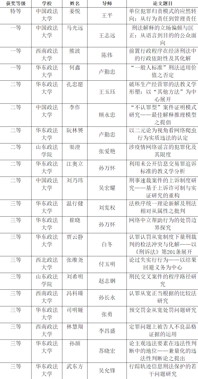 其中,由王平教授指导的刑法学专业2019级博士研究生姜悦同学荣获唯一的特等奖;王志远教授指导的刑法学专业2018级硕士研究生马光远同学荣获一等奖;顾永忠教授指导的刑事诉讼法学专业2018级硕士研究生李作同学、吴宏耀教授指导的刑事诉讼法学专业2019级硕士研究生刘乃玮同学分别获得二等奖。特此祝贺!