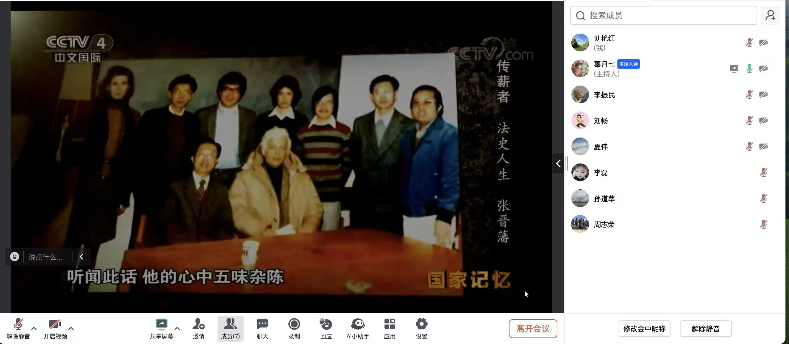 参观完主题展后,刑法所党支部全体党员开展线上线下集体观看纪录片并进行交流分享。首先,在教学图书综合楼0719会议室和线上腾讯会议全体党员共同观看了《国家学习》关于张晋藩先生的纪录片。张晋藩先生作为 “人民教育家”,在法学教育领域辛勤耕耘数十载,为国家培养了大批优秀的法学人才,张先生的学术成就和教育理念深刻触动了每一位党员。