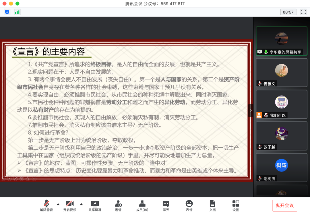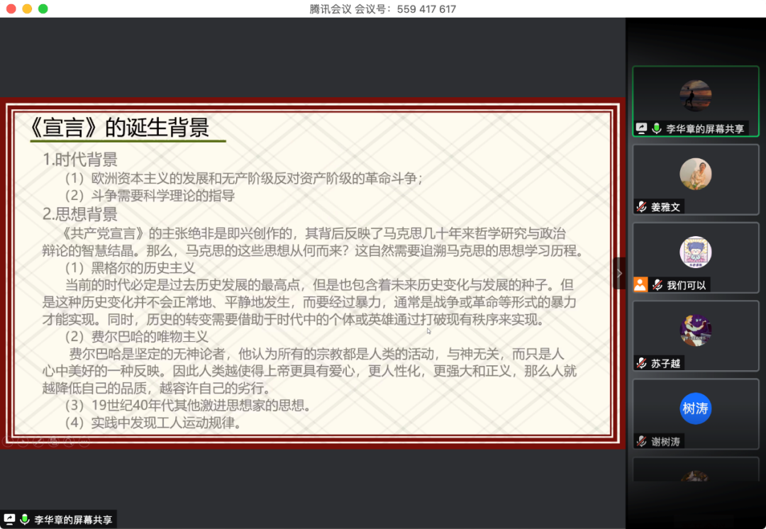 最后李华章同志讲述了《共产党宣言》的当代价值。《共产党宣言》在当代社会主义建设过程中具有极其重要的理论价值,李华章同志认为,其中最重要的有三点:首先是《共产党宣言》的终极目标人的自由而全面的发展。这是对共产主义崇高理想的最凝练的概括,只有牢牢把握这一终极追求,才能理解我们党为人民服务的宗旨的含义,才能理解疫情期间党和国家为何坚持不惜代价救治患者。也时刻提醒我们党要牢记“发展为人民,发展靠人民”;其次是实事求是精神。《共产党宣言》为我们留下了非常宝贵的精神财富,实事求是精神便是其一。实事求是精神时刻提醒着我们,我国还处于社会主义初级阶段,中国特色社会主义建设必须结合我国国情,以经济建设为中心,大力发展生产力;再次是正确对待私有制问题。私有制的存在是历史事实,其不可能短期内消灭。《共产党宣言》指出,“共产主义并不是要废除一般的所有制,而实要废除资产阶级的所有制”。因此,消灭私有制并不意味着要剥夺公民的不用于剥削他人劳动的私有财产,消灭私有制不等同于消灭公民个人合法的私有财产。我国《宪法》也明确规定国家保护公民合法的私有财产。最后,李华章同志总结:我们必须实事求是,以科学客观的态度对待《共产党宣言》,这样才能更好地发挥马克思主义对中国特色社会主义建设的指导作用。