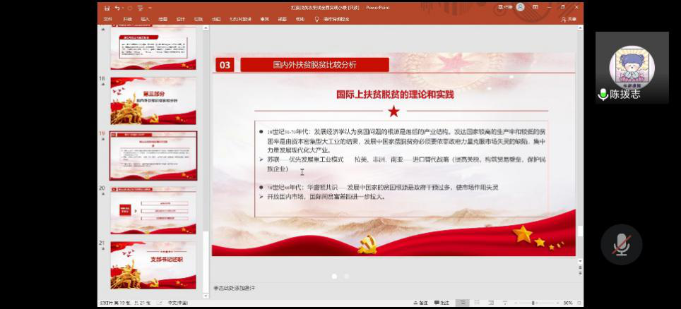 在支部书记讲党课环节,陈拨志同学结合总书记在决战决胜脱贫攻坚座谈会上的讲话以及自己的生活经历,从“我国脱贫攻坚取得决定性成就”、“脱贫攻坚战面临的困难挑战”以及“国内外扶贫脱贫比较分析”三个方面展开论述。陈拨志同学指出,今年是脱贫攻坚的收官之年,决胜之年。党的十八大以来,我党明确了到2020年我国现行标准下农村贫困人口实现脱贫、贫困县全部摘帽、解决区域性整体贫困的目标任务。就目前来看脱贫进度符合预期,成就举世瞩目,具体表现为:脱贫攻坚目标任务接近完成,贫困群众收入水平大幅度提高,贫困地区基本生产生活条件明显改善,贫困地区经济社会发展明显加快,贫困治理能力明显提升,中国减贫方案和减贫成就得到国际社会普遍认可。在肯定脱贫攻坚取得决定性成就的同时,陈拨志同学也指出当前脱贫攻坚工作面临剩余脱贫攻坚任务艰巨,新冠肺炎疫情对外出务工、扶贫产品销售、产业扶贫等工作的不利影响,巩固脱贫成果难度很大以及一些地方脱贫攻坚工作松紧懈怠、精力转移等问题挑战,这些问题挑战应当予以高度重视,并有针对性解决。随后,陈拨志同志采用比较分析视角,详细介绍了国际上扶贫脱贫的理论与实践,并与我国的经验进行比较。最后,陈拨志同学结合所讲内容,指出了中国扶贫脱贫的三点启示,即坚持党的领导,正确处理政府和市场间的关系以及实施精准扶贫与精准脱贫。