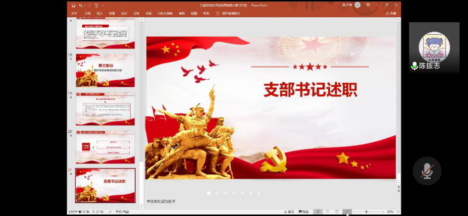 在支部书记述职环节,支部书记陈拨志同学从取得的成绩、工作中存在的主要问题及原因以及下一步工作的思路与措施三个方面向支部党员做上一年度的述职报告。述职报告坚持问题导向,侧重问题与不足。做完述职报告后,支部党员就陈拨志同志的述职报告积极提出自己的意见与建议。