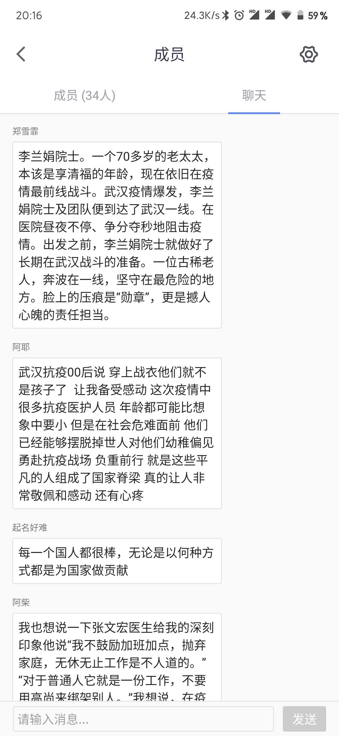 随后,在党支部书记的组织下,大家围绕疫情期间“如何践行党员初心使命”“如何发挥共产党员先锋模范作用”这两个主题开展集中讨论。大家通过语音或者是文字的方式,积极分享了在抗击疫情期间涌现出的让人印象深刻的先进人物和典型事迹,或是自己身边抗疫过程中的感人故事,表达了自己对这两个主题的见解,纷纷感慨党员应该通过力所能及的事情践行初心使命,发挥共产党员先锋模范示范作用。