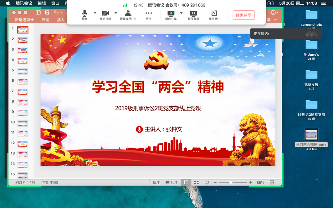 时值2020年全国两会开幕之际,2019级刑诉2班党支部借助腾讯会议软件,于2020年5月26日开展了党日活动,支部16名党员悉数参加。活动分为两个部分,第一部分学习全国两会精神,重点关注今年两会与以往的变化;第二部分观看五四演讲,并重温习近平总书记五四讲话、探讨五四精神的当代意义。