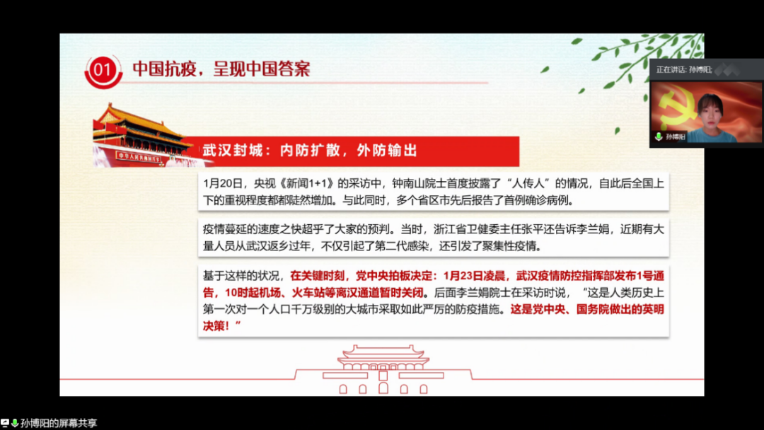 最后,孙博阳同志结合国全球抗疫工作,以“助力全球抗疫,诠释大国担当”为主题分享了中国在全球抗疫工作中做出的巨大贡献。她谈到,中国是最早遭受新冠疫情侵扰的国家,同时也是世界人口第一大国,因此,中国的抗疫行动不仅是对自己负责,也是对全球公共卫生事业尽责。中国人民在党的领导下,秉持着“人民至上”的理念,为世界呈现了一份精彩的“中国方案”,中国人民也用“奉献”在这份中国方案书写了动人篇章。中国在做好“内防扩散,外防输出”工作的同时,坚持和推动抗疫全球合作,秉持“公开、透明、及时”原则,与世界分享疫情防治工作信息和经验。除此之外,中国也尽己所能,向疫情相关国家援助物资、派遣人员,用实际行动回馈世界在中国抗疫初期对中国的关切。“中国方案”,彰显了中国力度与中国速度,体现了中国智慧和中国担当。