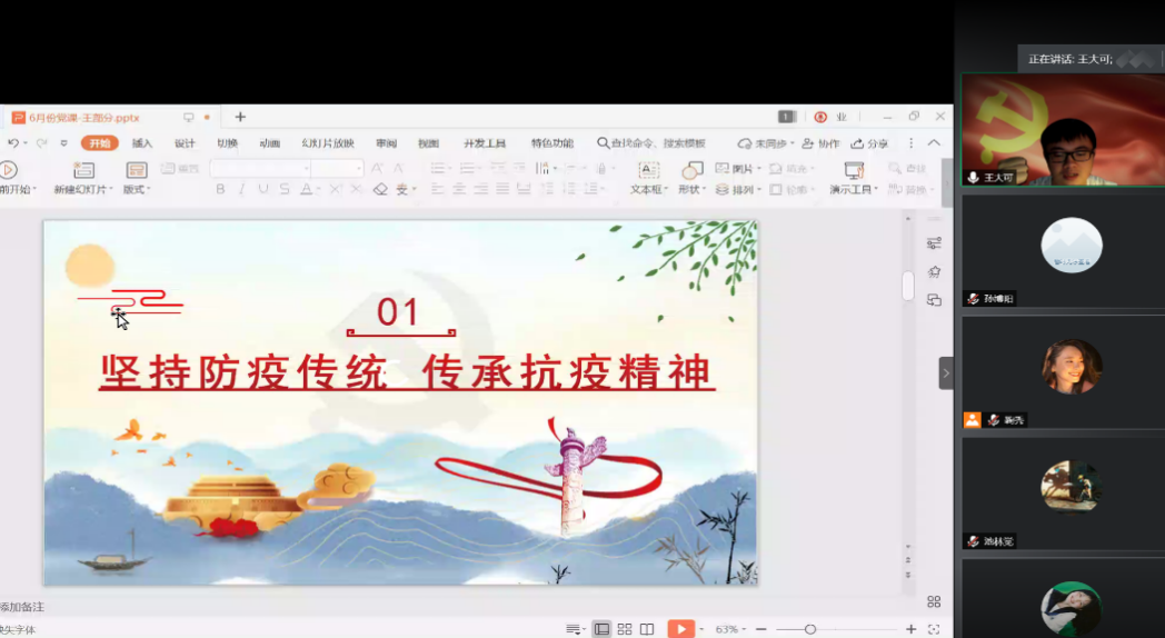 6月30日下午3时,2019级刑诉一班党支部在腾讯会议开展“治理有我、健康强国”的主题党日活动。本次党日活动由“治理有我、健康强国”专题学习分享,“青春之花在党和人民最需要的地方绽放”专题党课和重温入党誓词三个模块构成。